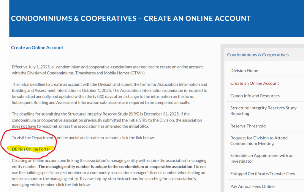 Effective October 1, 2025, all Florida condominium and cooperative associations are required to register with the Department of Business and Professional Regulation, Division of Condominiums, Timeshares and Mobile Homes. To do so, please click on the link immediately below. There you will find detailed instructions, including how to set up your account to be managed by your property management company / property manager, if you have one.