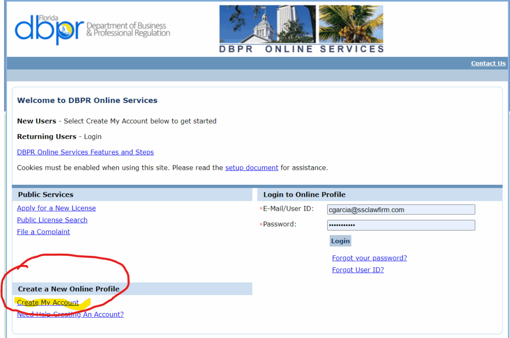 Once you click on the above link, you will be brought to the below page. Click on the “DBPR’s Online Portal” link, shown below.